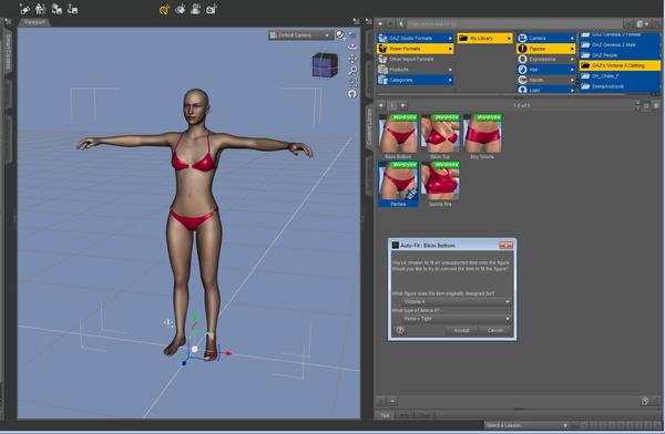 Also habe ich eine Genesis1 Female aufgerufen und dann die Bikinis per Doppelclick geladen. Daraufhin fragt ein Dialog, für welche Figur das Wearable ursprünglich designed wurde. Die Auswahl, die ich getroffen habe, siehst Du im Bild und auch das Resultat.