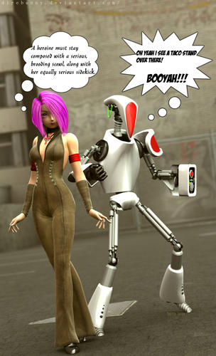 a girl and her robot fighting crime and then taking a short break for some brooding.