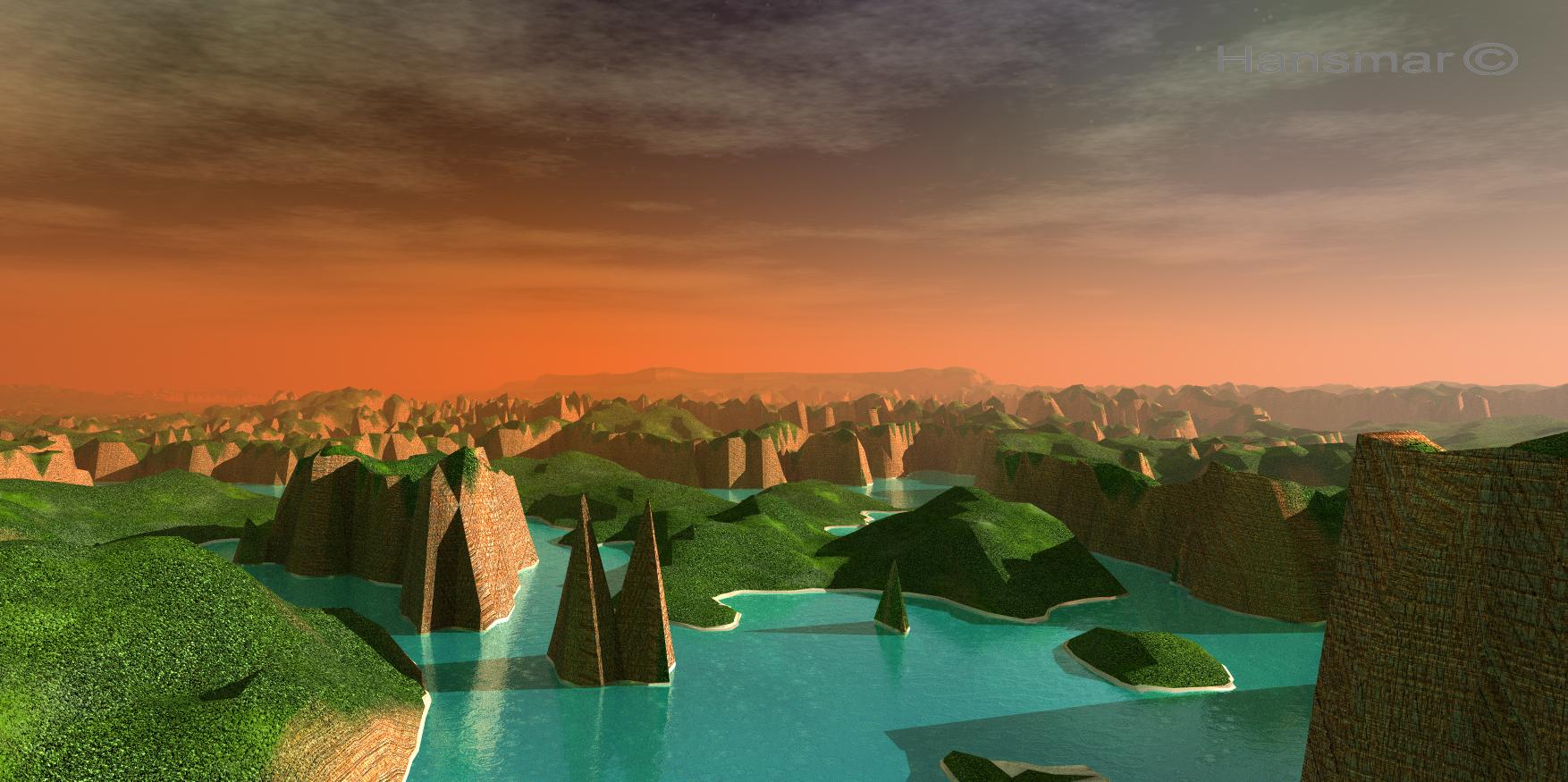 I have acquired the Terrain Editor Filters by Horo quite some time ago, but hardly ever tried them out. Now I have two renders with rather haphazard exerimenting. The combine some fiddling in the Terrain Editor of Bryce with some effects in the Filters. For the second one, the effect is quite visible. I used some of the Fantastic skies by Horo and David Brinnen.