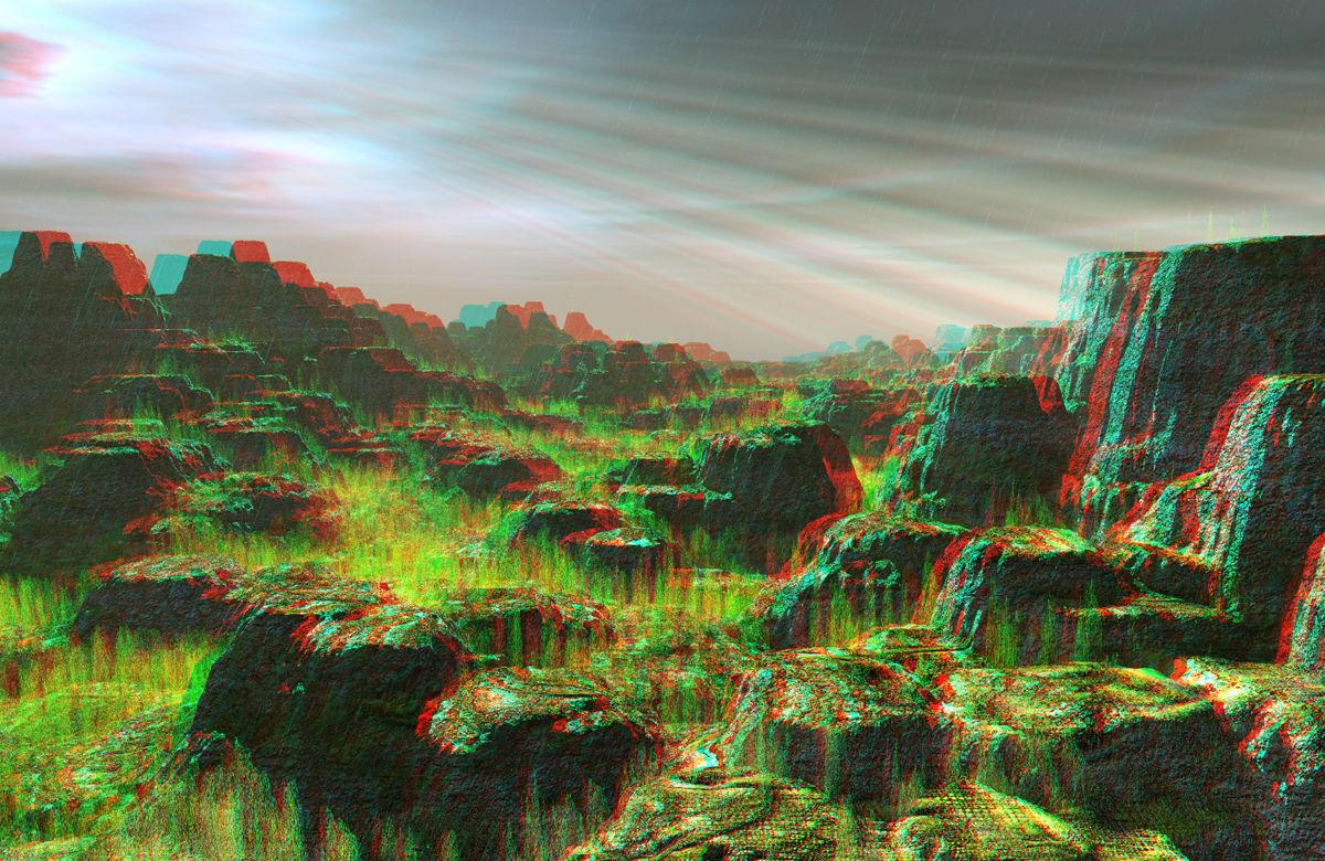 Although we all agree that the fir trees above are not very convincing, I gave it another try and call the "fir trees" now grass-like vegetation. Not that it is any better, nevertheless I like the greenery being watered in this downpour - and I think the anaglyph looks quite nice.