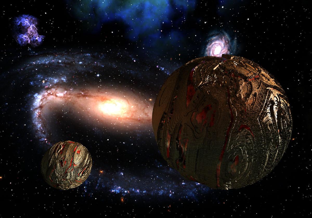 Experiment with displacement. A 16-bit greyscale TIFF (exported from the TE) was loaded as a picture texture (converts automatically to 8-bit RGB) and used to control displacement (20%). Within the displaced sphere a slightly smaller one with a red material. The rest are also spheres with volume materials (2 nebulae and one galaxy). Bryce stars plus a 2D-Face with stars and an HDRI. File size without the HDRI below 1 MB, memory usage about 350 MB (with HDRI file size 44 MB, memory 460 MB).