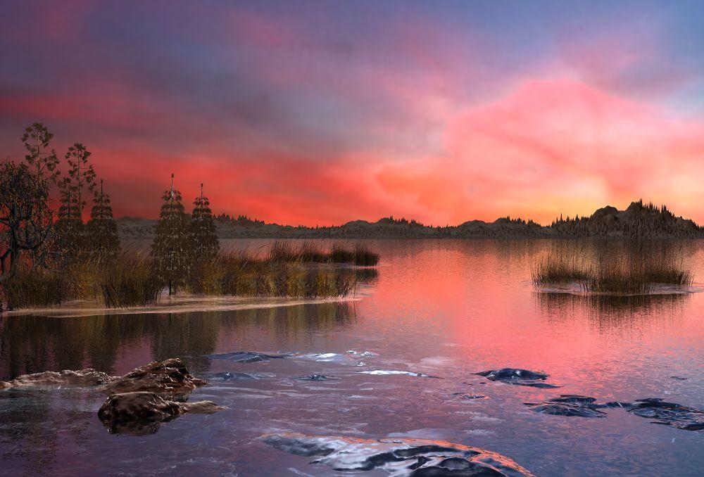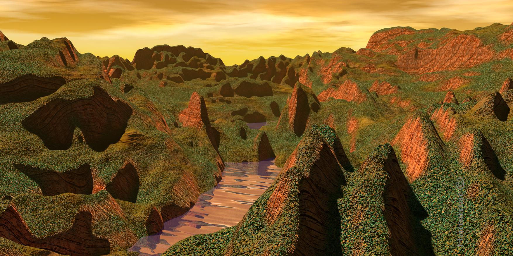 Two landscapes from me. The second one is on the same basis, but I modified it. The basis is a painting that I used for heightmap, but which I smoothed quite a bit. For the second one, I used the deep terrain editor.