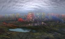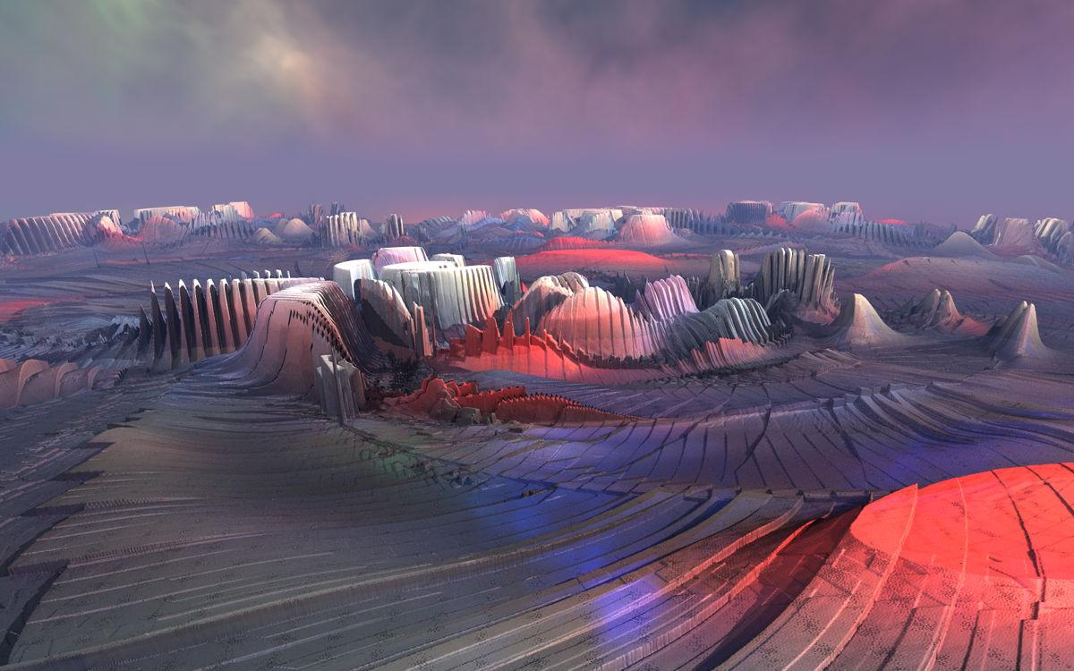 Again the abstract on the previous page as base for terrains. The abstract itself is mapped object top onto the terrains are not solid and have a bit of transparency so that the HDRI (Gasclouds_B01) that makes the sky and ambient light shines through and contributes to the colours.