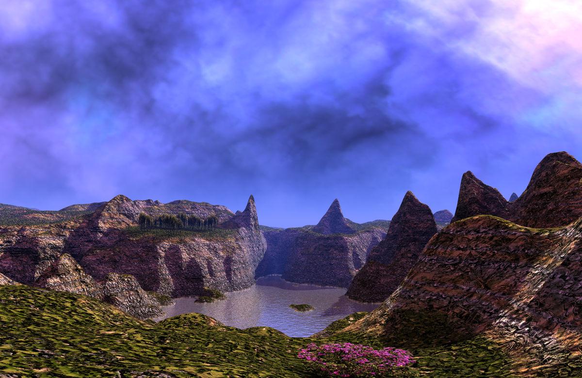 Horo, this is an unusual terrain scene, which makes it so interesting.  I see a small forest in the back and I like the addition of the flowers up front.  I've been putting off using trees and bushes.  This makes me want to try.
