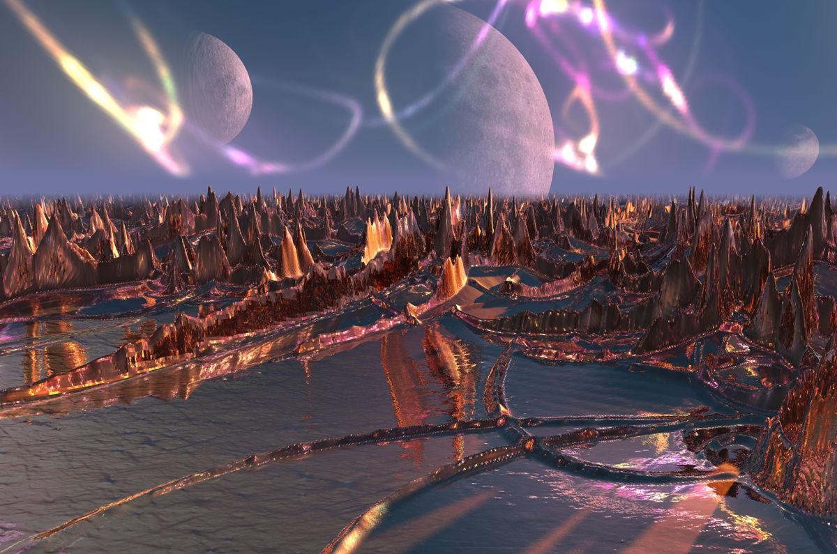 Another terrain made from an HDRI (NeonWires from HDRI4Fun) that also makes the sky. The moons are spheres with the moon image by Dave Savage. The material an the terrain is from Fifty Funky Shapes & Fifty Funky Metals.