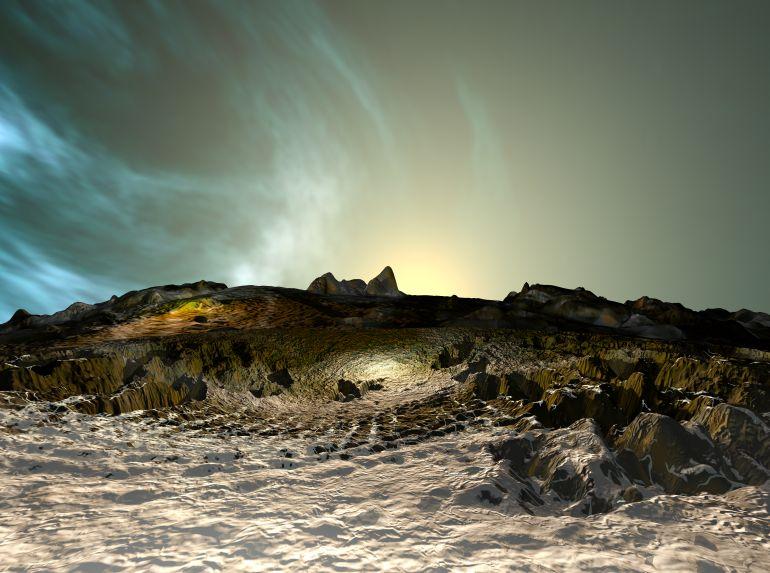 The Spikyland terrain was made from an HDRI that also makes part of the sky together with Bryce clouds and the sun. The material applied is from High Resolution Terrain 4.