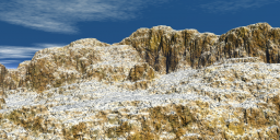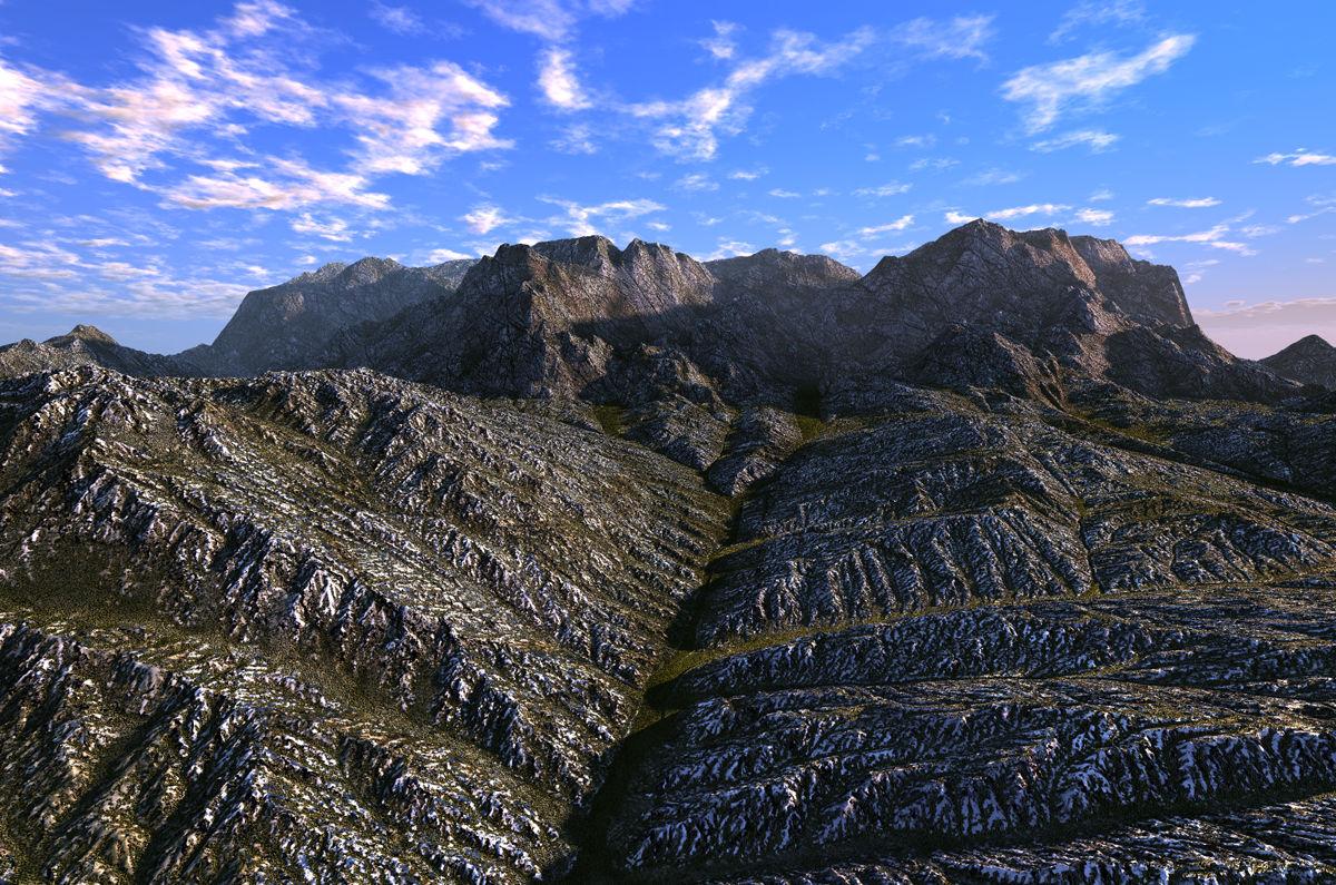 A terrain from Gritstone Hills with a material assembled from two sets (High Resolution Terrains 1 and Landscapes under Fantastic Skies). Ambient light by the Field2b_CSD HDRI from Object Clouds 2D & 3D like the cloud slab.