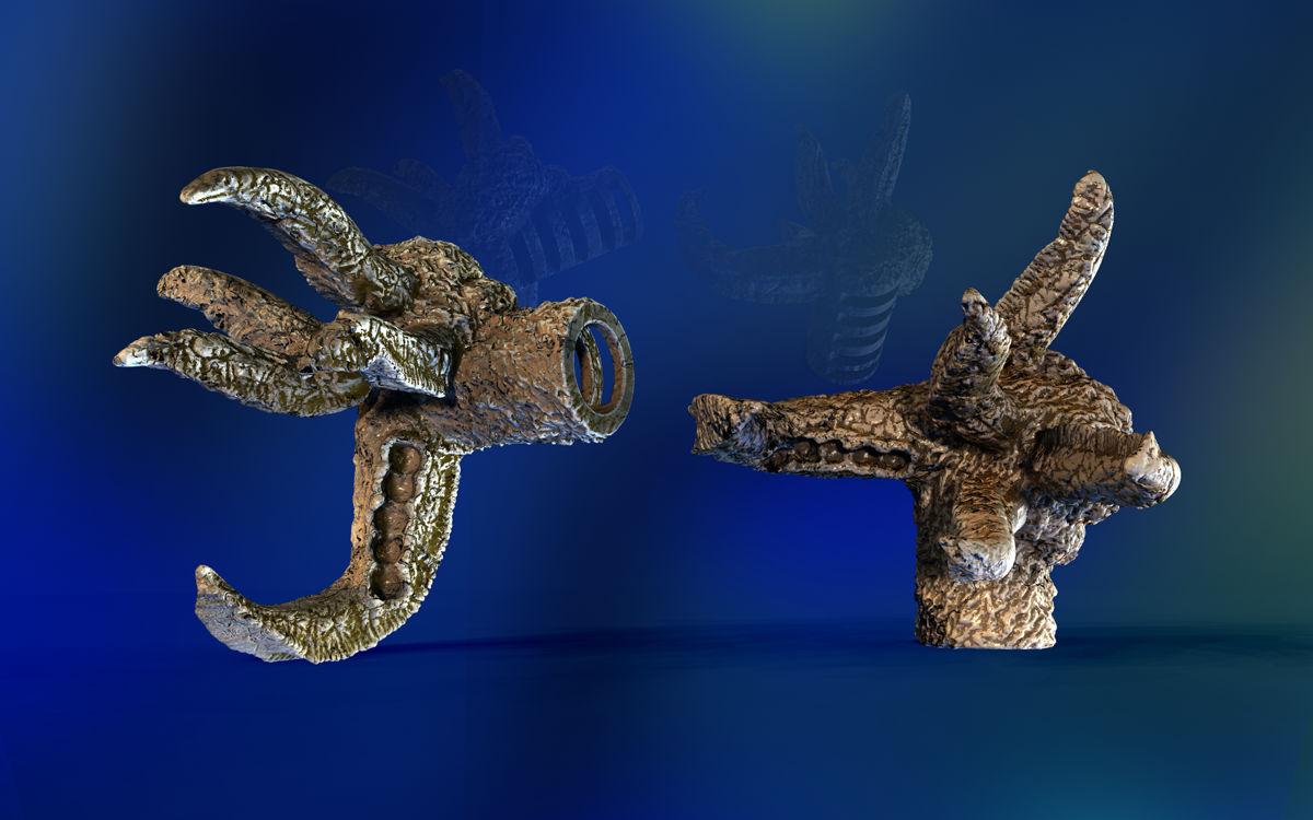 An Alien Artifact by MatCreator and an instance of it with slightly different materials on a Shadow Capture Disk and behind a tilted 2D-Face, transparent and a bit reflecting, lit by an HDRI and a bit of sun. In the anaglyph, the tentacles reach out to grab you ...