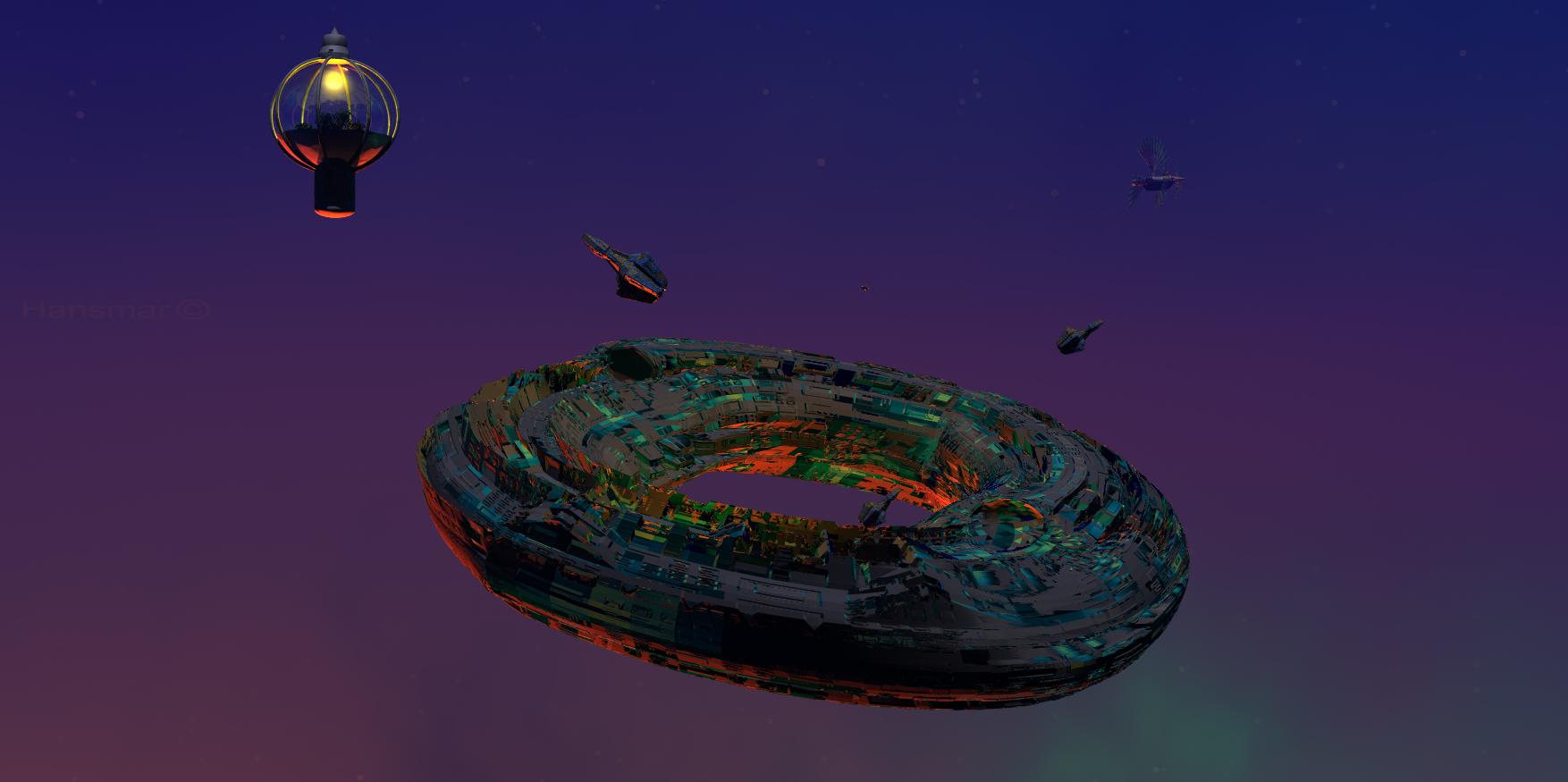 A very different render: I used a torus and a texture where one part provides the texture as such, but another provides the displacement map. I added a part of the Sky city, a solar sail and some (instances) of a space ship. A Fantastic sky completes it (though I modified it a bit). I call it 'donut-world'. I call it 'donut-world'. There are two lights in the 'world with limited effect on the surrounding.