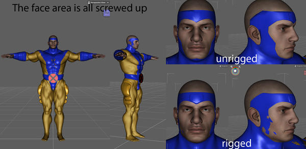 I am attempting to create Jean Grey's 90s style costume for M6. Unfortunately, when I use the transfer utility to rig the darn thing, it turns out OK for the most part (will need some tweaks) except for the face mask area. I have tried all the suggestion that were offered up on this topic but I think I am doing something wrong. The first image is the unrigged and the second is rigged. Also pictured, is a close up of the face; unrigged and rigged.