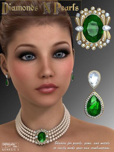 The timelessness of pearls and diamonds is brought to you in this elegant jewelry set for your Genesis 2 Female characters. Bring glamour and style to your renders with a four-strand pearl necklace, a neck broach, a set of earrings, two different bracelets, and an optional unparented broach prop. Shaders for the gems include amethyst, diamond, emerald, ruby, sapphire, and topaz. Shaders for the pearls are in pearly white, pearly black, pearly antique, pearly yellow, and pearly pink. Various metal shaders are also included