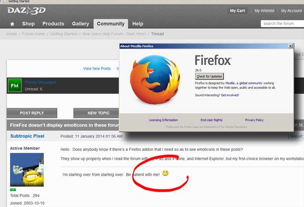 They show up properly when I read the forum with my iPad and iPhone, and Internet Explorer, but my first-choice browser on my workstation is Firefox.
