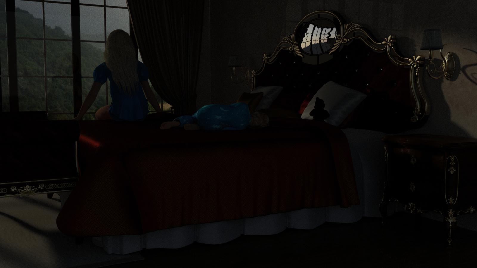 @bastian2560, I really like where this image is going, but one thing continues to bother me. The piece of furniture at the foot of the bed looks like it's cutting through the bed. I opened the image in Photoshop and lightened it enough to see that it is only up to the foot of the bed, but as dark as the interior is, I think it would help to move it away from the bed by a a few "inches." The image might also look good if this piece of furniture is removed altogether.