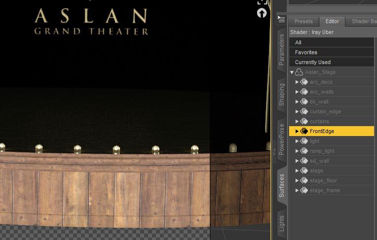I selected the Aslan Theatre in the scene pane, then the stage floor in the surfaces tab and applied the shader presets. It seemed to work fine for me - attached are two quick pics, sorry they are grainy as I didn't let them run for long - but I hope you can see the grain well enough.