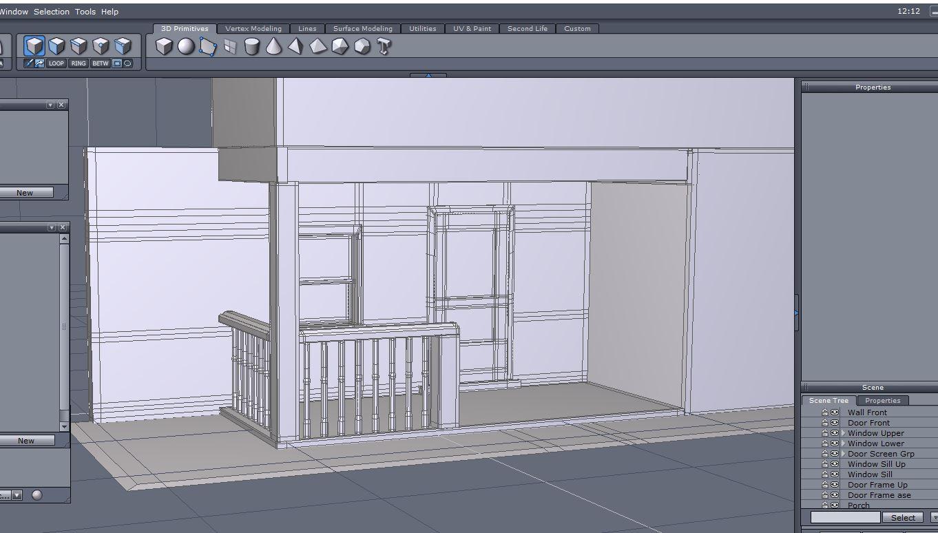 And here is the mesh of a porch that I made. It loosely follows a Dreamlight tutorial, except I modeled the screen door and main door so they can be rigged and opened/closed. Same for windows.
