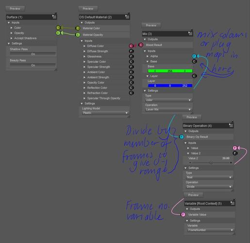 Have you looked at the Shader Mixer? If so, you could copy your existing materials (if any) from the currently selected surface using the pane's own file menu, then using the brickyard create a layout like the one plugged into Diffuse colour on the DS Default Material brick here - my results, with nothing else modified so it's very basic, are shown on the little sphere.