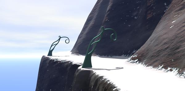 I set up the basis for the foreground portion of the image, which is a path winding around a cliff with what will be light-posts of Avin design. I'll be adding more to it later, with the path winding out from behind the foreground cliff, up to a bridge (also of Avin design) and leading into the city... You'll see buildings, etc).