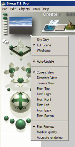 I tried that last night...also moved my camera ball every which way, even viewed the scene with other viewpoints and moved objects around. Strangely enough the preview of the scene remains exactly the same, very much as what you see in my earlier post.... I've changed the moon disc to a smaller and more realistic size (actually it was the Sun at first, oops) but everything else seems "stuck" as in the posted image here... I have not tried the "daylight" scene to see what it will do. Today I even went into my Windows 8 settings and deleted history and temp files, not sure whether that would have any effect. In fact last night Bryce seemed oddly slow for some reason....