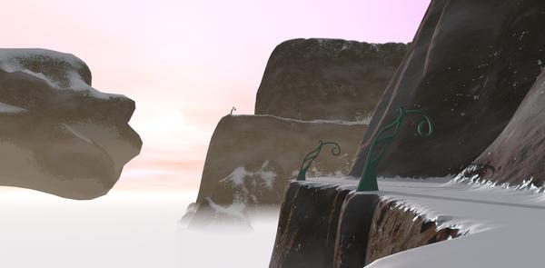 This render is what I would really just call a basic "block-in" shot for what will (eventually) become a narrow, winding mountain path leading up to the city of an elusive race, known as the Avin, from a fantasy world I've been working on for some time. As I'm just starting out with learning Bryce seriously, and do my best learning when I have a specific context to do it in, I figured taking locations from around that fantasy world would be the perfect approach.