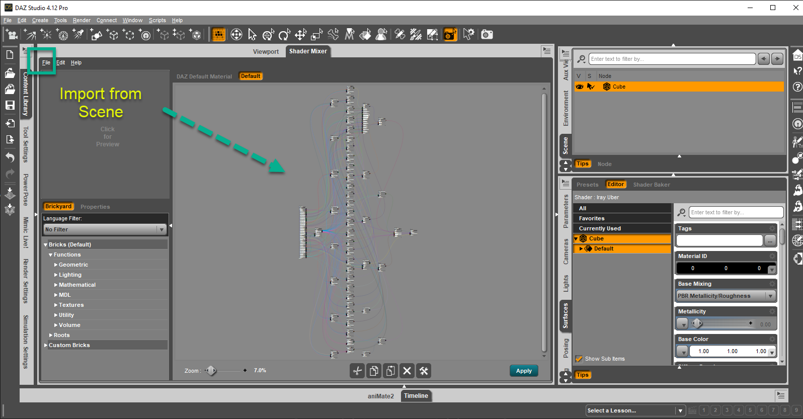 If one "imports from scene" from a basic new cube, one sees quite a lot of wires! I understand the concept is to plug in each brick to another and somehow one is also going to connect to the object for display.