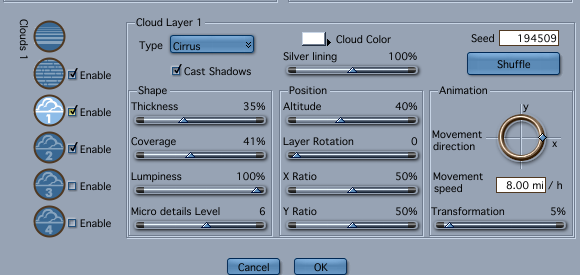 Another animation consideration that I'm not sure about atm, is the volumetric cloud settings, where you have a similar field to the clouds in the atmosphere tab. I imagine, due to this, that you would set a high number for a lot of change, low for less.