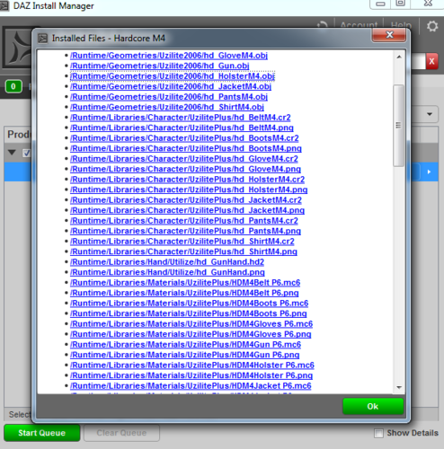 2. I’ve installed it using default DAZ Content Installer. It went successfully and listed all the files and directories, so I could verify it was indeed installed. (Please see screen0.png attached). As you can see, the path for OBJ, for example, is C:\Users\Public\Documents\My DAZ 3D Library\Runtime\Geometries\Uzilite2006.