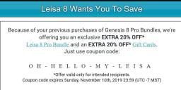 today's blue banner discount code for the leisa 8 pro bundle doesn't work.  on the leisa 8 pro bundle, or on gift cards.