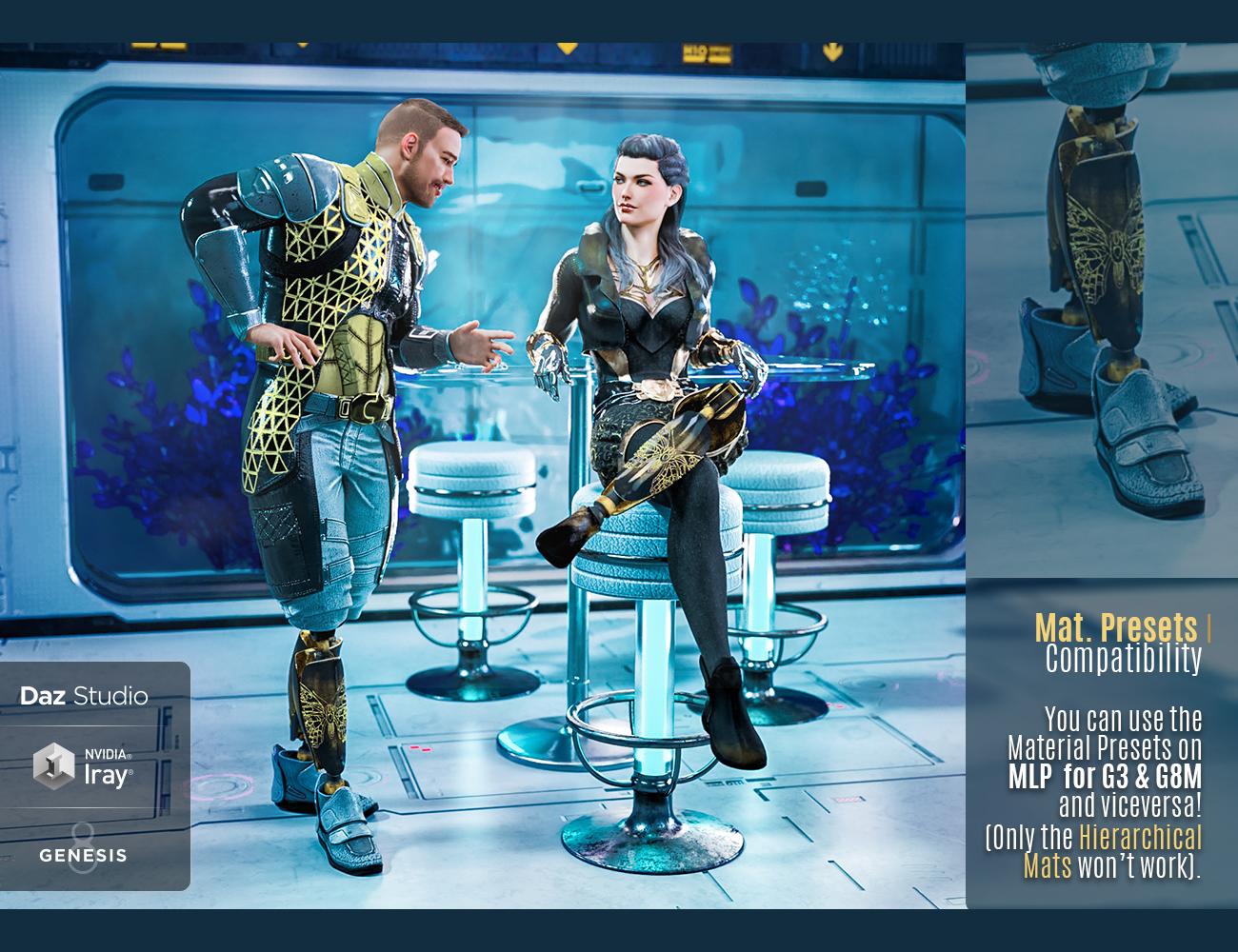 Compatibility: The Prosthetic Leg shares the same UVs as the male version, so you can swap materials between the products. The only preset that will not work across genders are the hierarchical iray presets for the designer sets. However, you can apply the designer sets via the separated props.