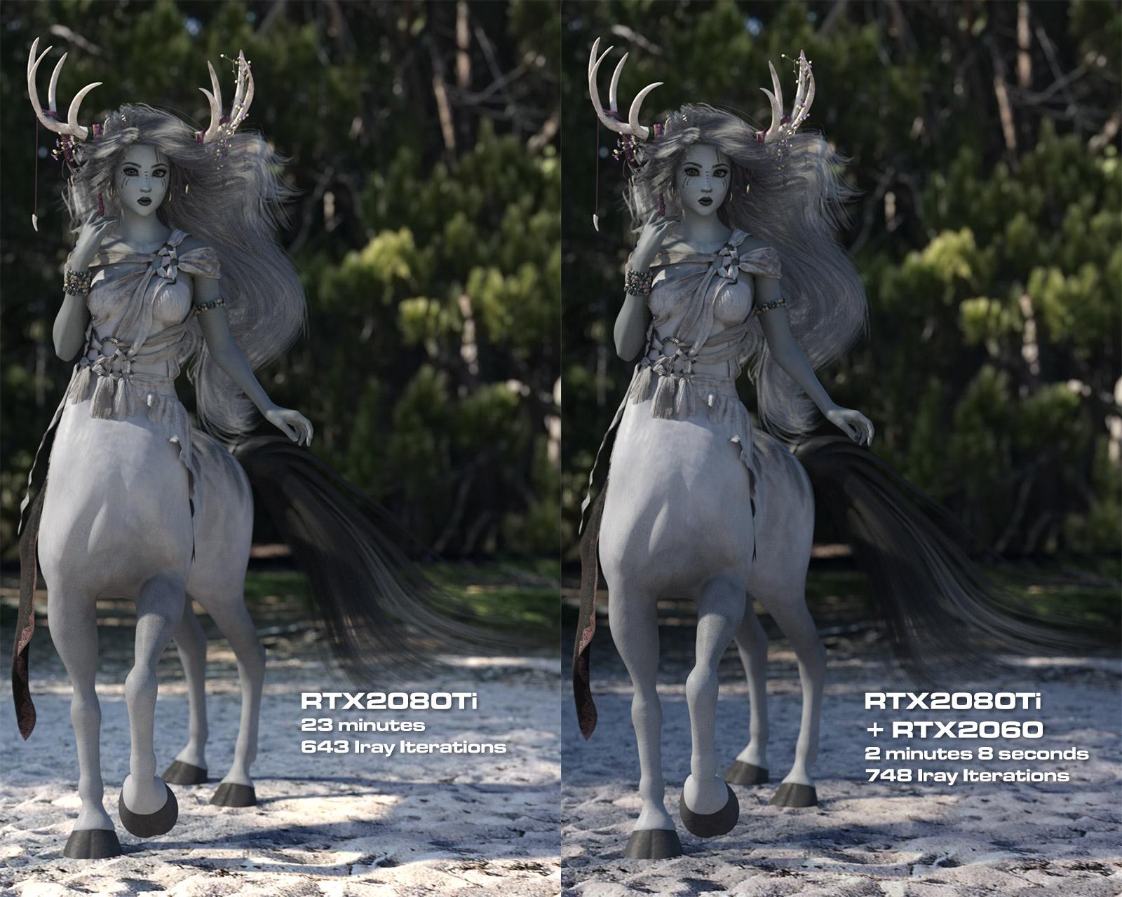 I recently upgraded from my 7 year old Alienware R4 desktop to a spec-cranked R8 and the RTX2080Ti I bought to replace the RTX2060 it came with wouldn't fit in the new case so I ordered a shorter (size) RTX2080Ti from Dell and have been running it on just that new RTX2080Ti for a week or two now.  Well last night I FINALLY got around to installing DAZ Studio on the new machine and ran a test render. Then I installed the RTX2060 alongside the RTX2080Ti and fired 'er back up. <SIGH>  Only the RTX2060 was showing in Nvidia and DAZ Studio wouldn't run, complaining about OpenGL drivers so I updated from v431 Nvidia Drivers to 441 released Nov 4.  I rebooted and ran DAZ Studio just fine, reloaded the exact same file I rendered before. OH! EM! GEE!