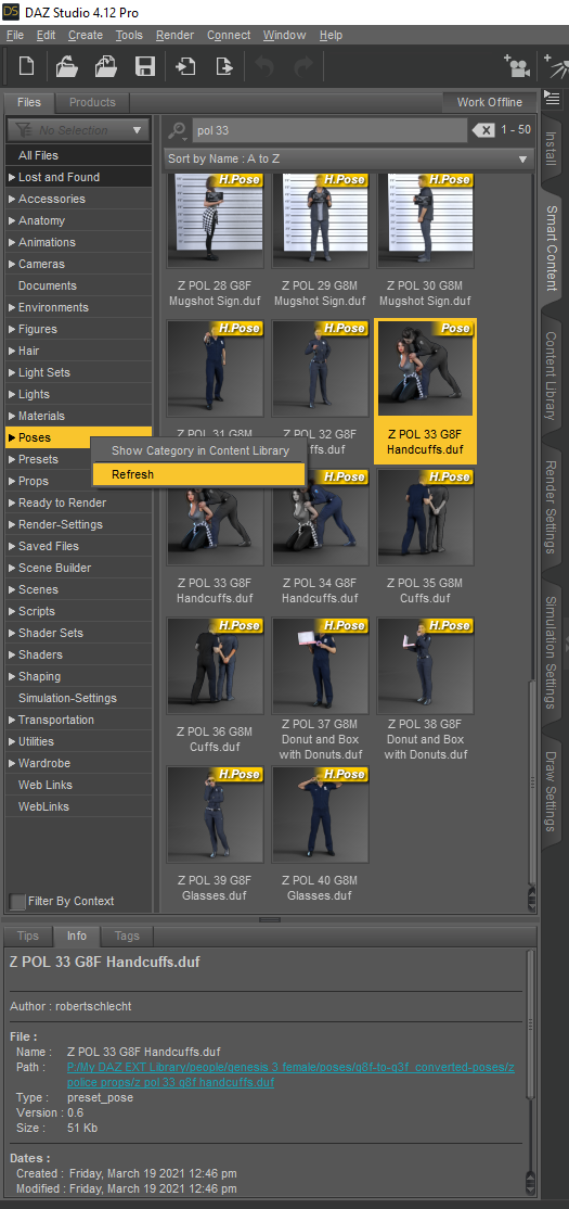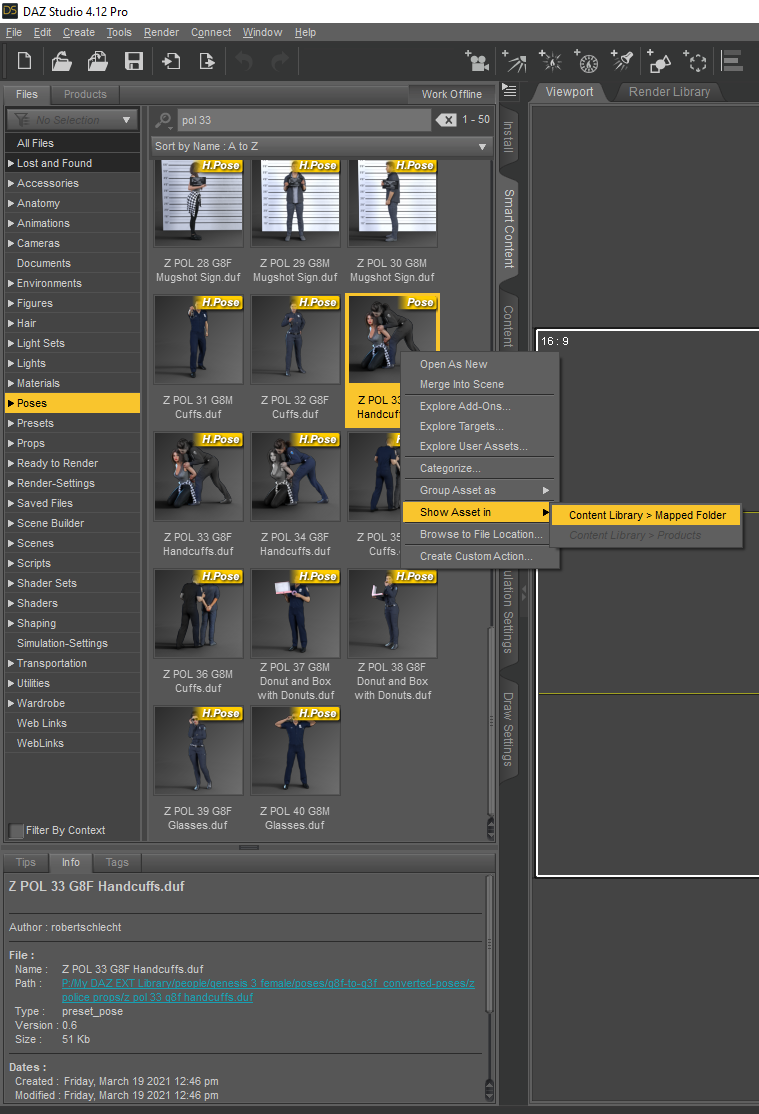 For example, in my Smart-Content-01 attachment, the highlighted image, Z POL 33 G8F Handcuffs.duf is actually the converted G3F version, but the name did not update. You will notice this converted pose says, "Pose" in the top-right corner, while the next pose in my smart content folder has the exact same product name, but says, "H.Pose" in the top-right corner (that is the original G8F pose).