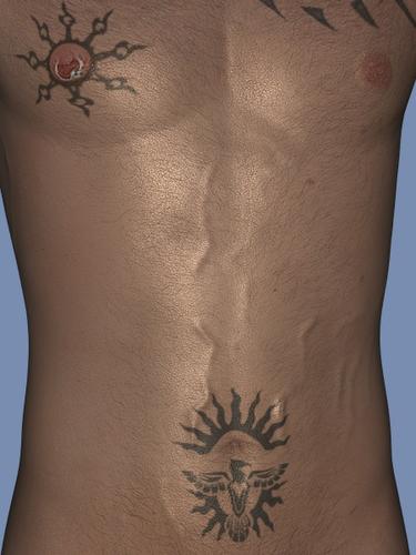 I am very excited to be presenting this update. First, let me say thank-you for purchasing, or considering purchase of, Michael 4 for Genesis 2 Male. A lot of work was put into this to make it a great product. I have reworked the UVs, smoothing out some areas especially at the back seam to make tattoos and other designs appear much better than before. See the pics below to see the differences.