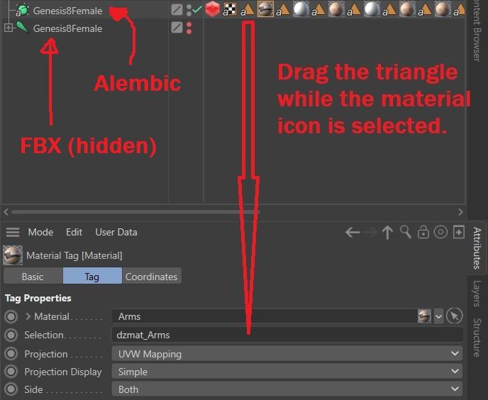 6) Create Materials and drag them onto the Alembic entry in the Objects pane (directly onto the name, as if parenting them to the object).