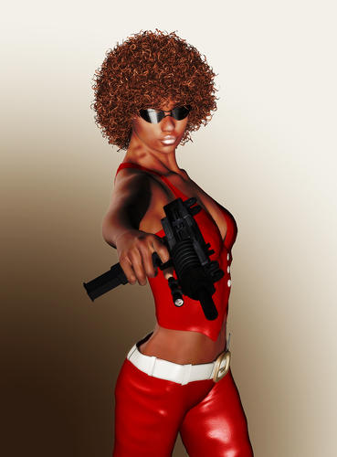 - Smacky by Snow Sultan, GenX'd, a combination of both her A4 and V4 morphs (pure A4 eyes in a mostly realistic texture look really strange to me) and also the +15 head from the V4 Maturing Morph Pack (also GenX'd) by Tempest to make Smacky look like the oldest; wearing leather jacket by Smay, GeniTanktop by Silverelf, BO Outrage jeans, WM Cowboy boots, and Romana Hair by SWAM; gun from the Stalker Girl set by Smay;