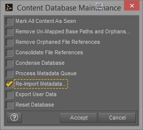 Right click on the Content Tab or the Smart Content Tab, (After closing DS, turning off CMS, removing the Database Files turning on CMS, launching DS, in that order) choose DB Maintenance (See Screenshot) then choose Re-import Metadata. (See Screenshot)