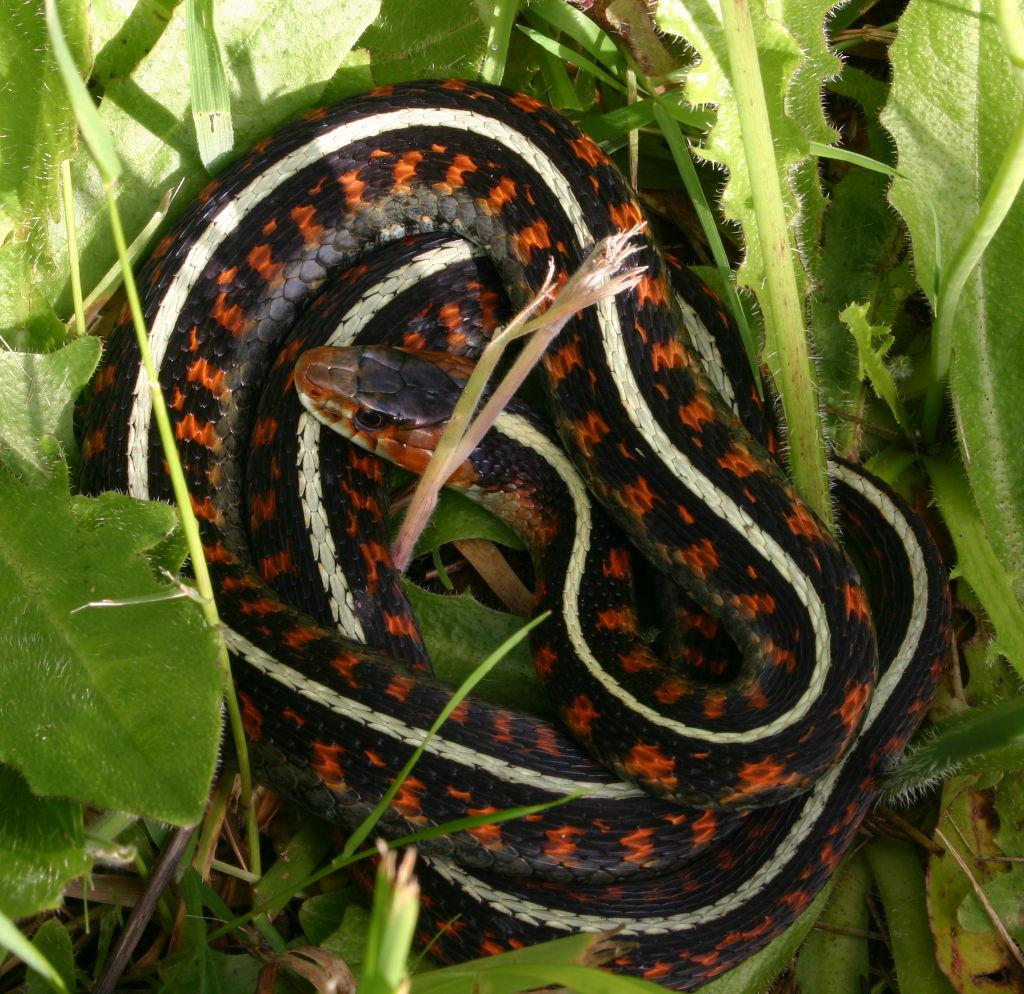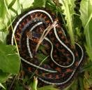 That's a very pretty specimen... our garter snakes around here are generally dull greenish-yellow and blackish-brown... although I've seen the yellow lean towards almost an orange, and the brown towards a dark olive green.