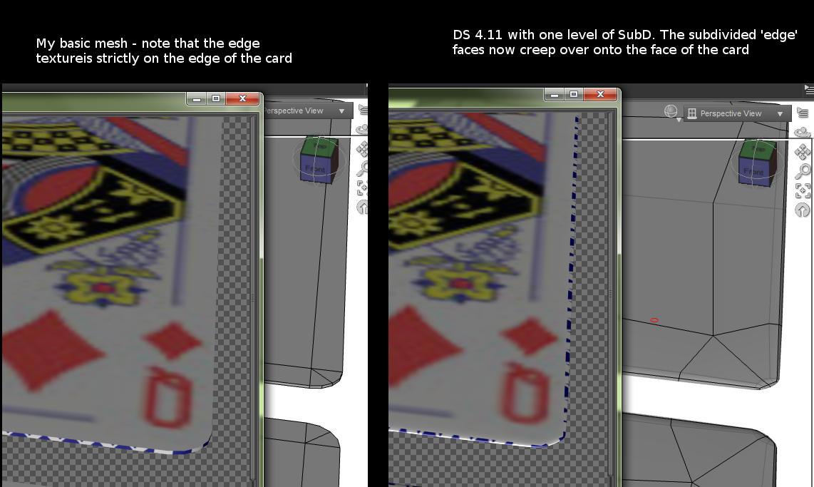 If you apply (in DS: Edit >Object > Geometry >Convert To SubD) just 1 level of that SubD then the edge ring of very thin faces that forms the side/edge/thickness of the card 'creeps' onto the face. So in my view it "doesn't work" (to be more precise, it specifically "doesn't work" with the settings I was using - there are probably a variety of ways round it)