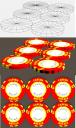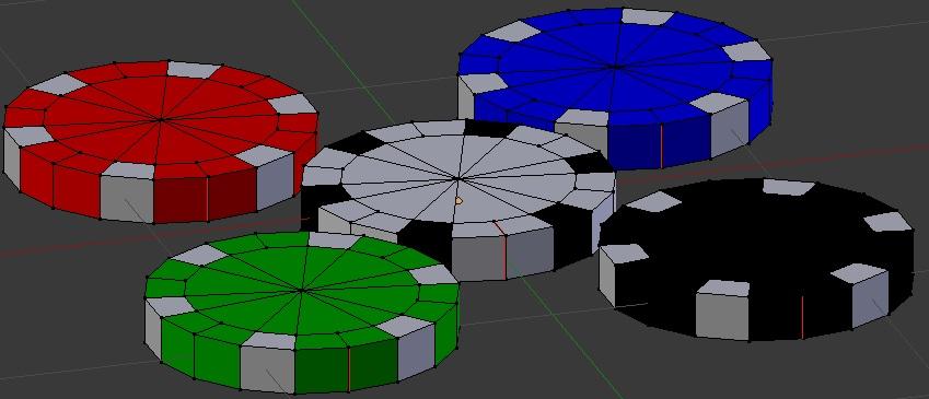 I'm trying to decide how many segments are necessary to avoid it looking too polygonish.The three chips in the top row have 16, 24, and 32 while thosein the bottom row have 18, 20 and 22.The black bits on the edges of some of the chips are because of the texture image - I should extend the colour slightly beyond the UV mapping lines