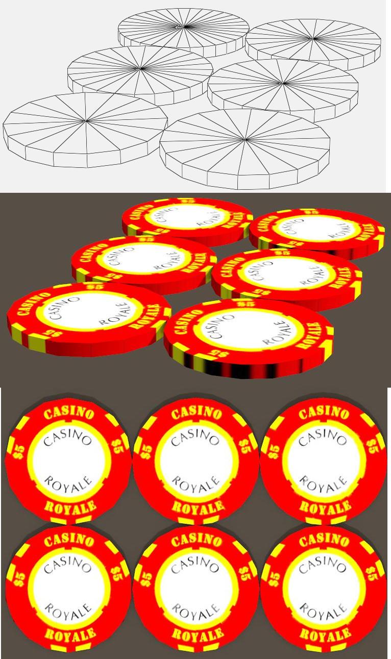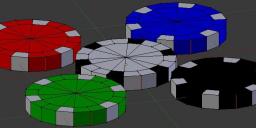 I should also probably redo the mesh. The one I'm using has 74 vertices / 78 faces, but was created so that I could use material zones for the white segments around the edges. I wasn't intending to do any UV mapping or texture image, but after googling some images I just got this inexplicable urge. Anyway, the two faces should really be reduced to simple triangle fans, so 38 vertices per chipand 54 faces (or 36 if I do tris to quads on the triangle fans).