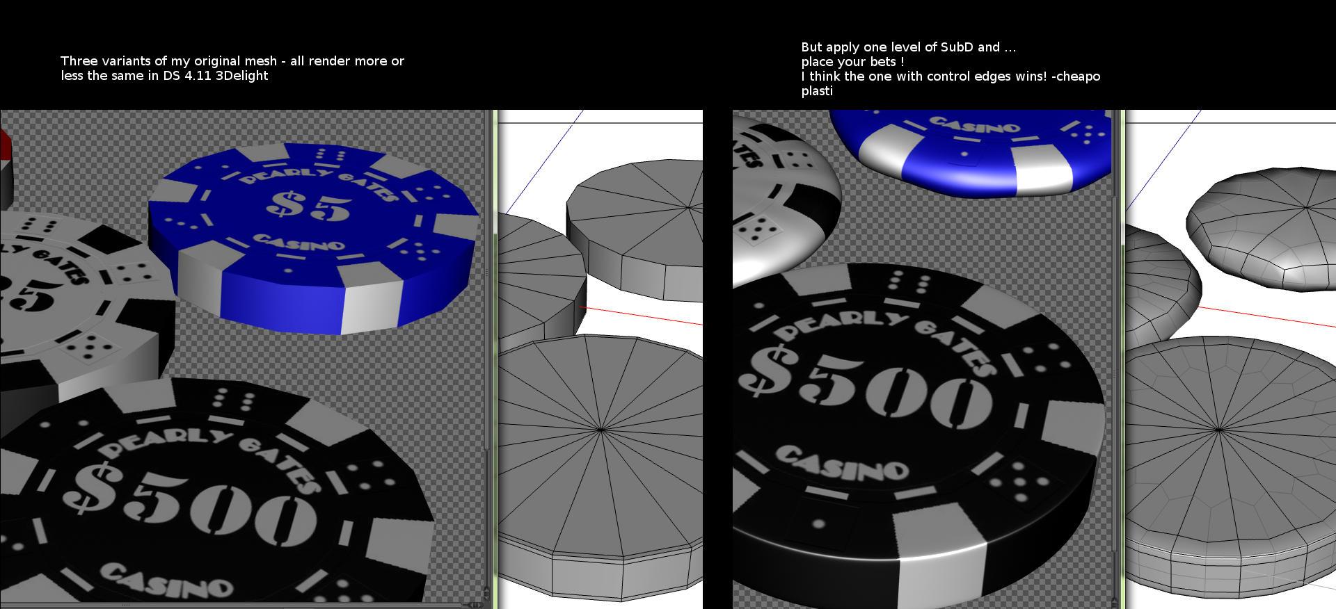 If I want to use the Poser/DS built-in SubD to make the chips less polygonish then I'll need to add control edges to stop the chips getting that classic inflated look. Just adding 4 control edges (one either side of both the upper and lower edge loops that bound the side of the chip) will more than double the face count. Two control edges would probably do. But I'd prefer not to bother, and instead to use a sufficient number of segments in the basic mesh to make SubD unnecessary. I'm thinking that 16/18 segments isn't enough, but 20/22/24 might be okay.