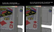 I created a single card mesh with rounded corners, all quads - 48 vertices, 46 faces per card. Three mat zones-face, edges, and back. Mapped the front to the top left card (2 of hearts) on my 54 card map, the back to the full UV map area, and the edges to pick out astripfrom the back. Then duplicated the mesh, moving it up slightly, and adjusted the UV mapping of its front to the next card (3 of hearts).