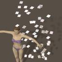 ...with one extra morph (a randomish z translationfor each individualcard) dialled up to several hundred percent, the two existing morphs (randomish rotation set to 100%,and the slide left set to several hundred%), and the prop (the full deck of 54 cards is a single prop) scaled down to10% of the current huge default size we're getting somewhere.