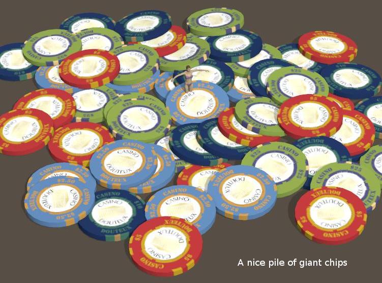 What about the default size of the chip prop ? I created the chips in Blender with a 1 unit diameter, exported OBJs, and imported those into Poser with no scaling - so each chip has an 8' 7.2" diameter.