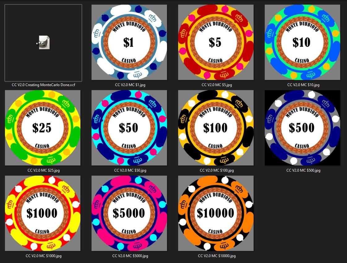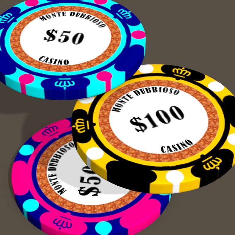 I've attached the texture images that I used for the chips. I created the basic design in GIMP using solid-colour layers with masks, which makes it easy to change colours. I'll probably do a few different chip designs based on googled photos (as I've said before this set is loosely based on the Casino De Montreal)and include the XCF/PSD.
