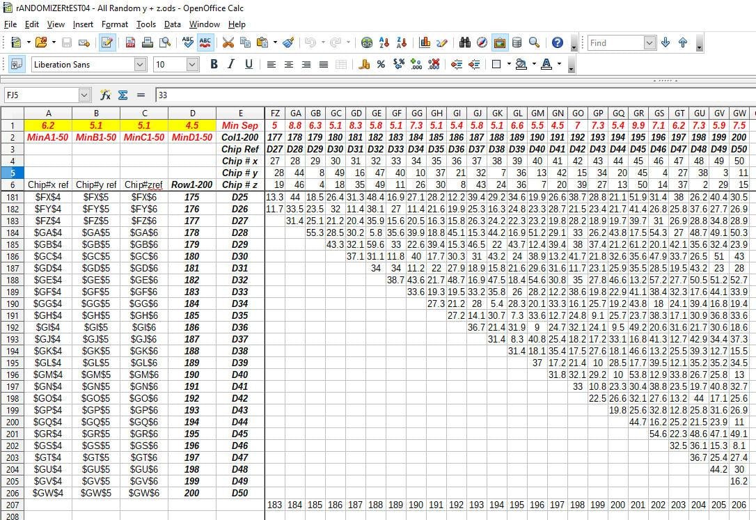 It's basically a spreadsheet into which I've entering pseudo-random x/y/z offsets (all integers 1-50 ) for 200 items.I let the spreadsheet calculate the distance between each pair of items (i.e. SQRT((Xa-Xb)^2 + (Ya-Yb)^2 + (Za-Zb)^2), and indicate which are the closest. Then I manually twiddle some of the x/y/z values to try and increase the minimum separattion - I've almost got it up to 5.0...