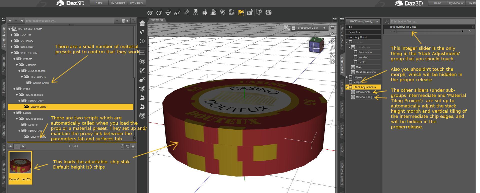 For your delight and delectation, the attached images show a single 54 chip almost-pre-release prop loaded at default settings. But since all 54 chips occupy exactly the same space that confuses the renderer, soI've applied small X/Y/Z morphs (1% to 5%) to move them slightly apart, but they still intersect (values of at least 20% to100%, depending on whether one, two or three of the translation morphs are applied, are needed to avoid intersection)