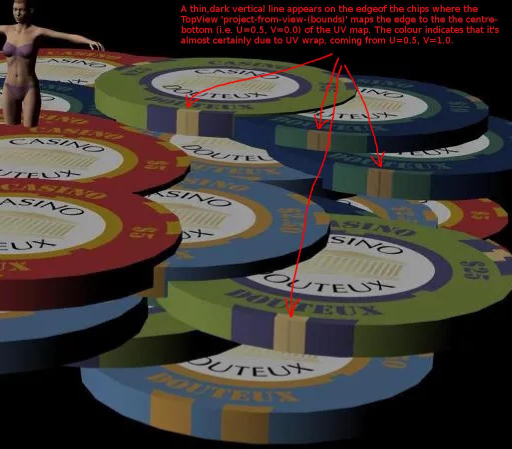 The five-in-one image was for the 50-chips-thrown-in-the-air prop (the prop has 10 chips of each type - I still reckon that for a chucked-in-the-air set of chips the ratio of $1:$5:$25:$100:$500 isn't that important. I made some mistakes in the model, mapping, and image which I need to fix, but didn'tbother me for theparticular render I was doing.