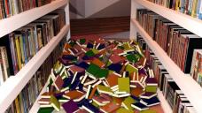 630 books dumped into a box roughly the width of the aisle. The actual shot I used was from a much lower angle so you won't see the books do go into the shelfspace.
