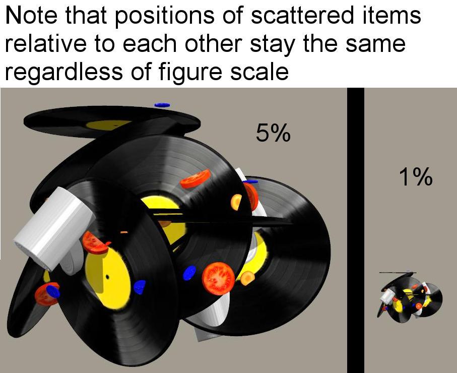 Edit 4 (3 Mar): One thing I realized when I did the LPs, veggies, cans, etc version - because I scaled the LPs up by a factor of 12, when I applied my scatter pose the LPs intersected each other and the other stuff too, so I had to manually adjust them. Adjusting the scale of the figure makes the whole scattered figure bigger or smaller, but if two scatters are just intersecting at 100%, then they're still just intersecting at 5%, 500% or whatever, like this...