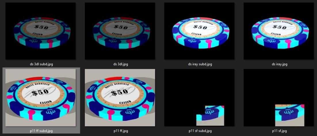 Edit 24 Feb: Rather than start a new post and bump this thread with no real progress, I'll just post these confirmation pics here. Test renders in Studio 4.12 3Delight/Iray and Poser 11 Firefly/Superfly of the four basic chip meshes both with and without subd, and Poser 11 Firefly/Superfly renders of the four basic chip meshes with Smooth Polys. They all seem fine, without any extraneous thin vertical line on the edge (although because the texture images are 75% quality JPG I think that the JPG artefacts around the + of the crown icon are causing a barely visible vertical line when subd is applied - but I only think I noticed that because I was specifically looking for it, so I'm happy to let it go). Also a Poser 11 of the four basic chip meshes above a mirror plane to verify that I've correctly corrected the rotation of the lower face UVs - I have.
