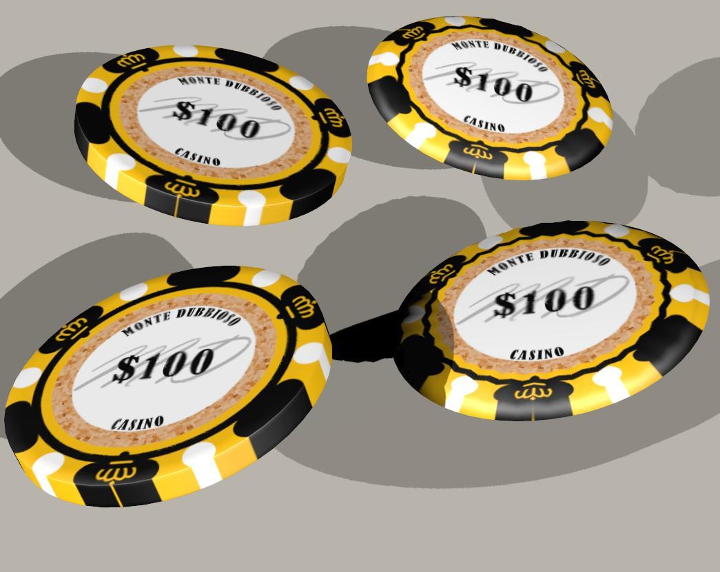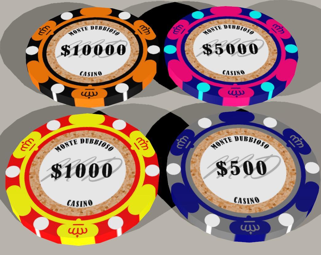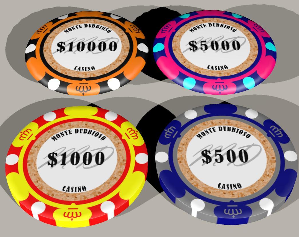 Edit 22 Feb: I've got the template for the Monte Dubbioso one (re)done now. Here's the $1,000 chip. It should simply be a case of changing the colours and the value (plain text) to get the rest. But I need to tidy up the layers in the XCF first.